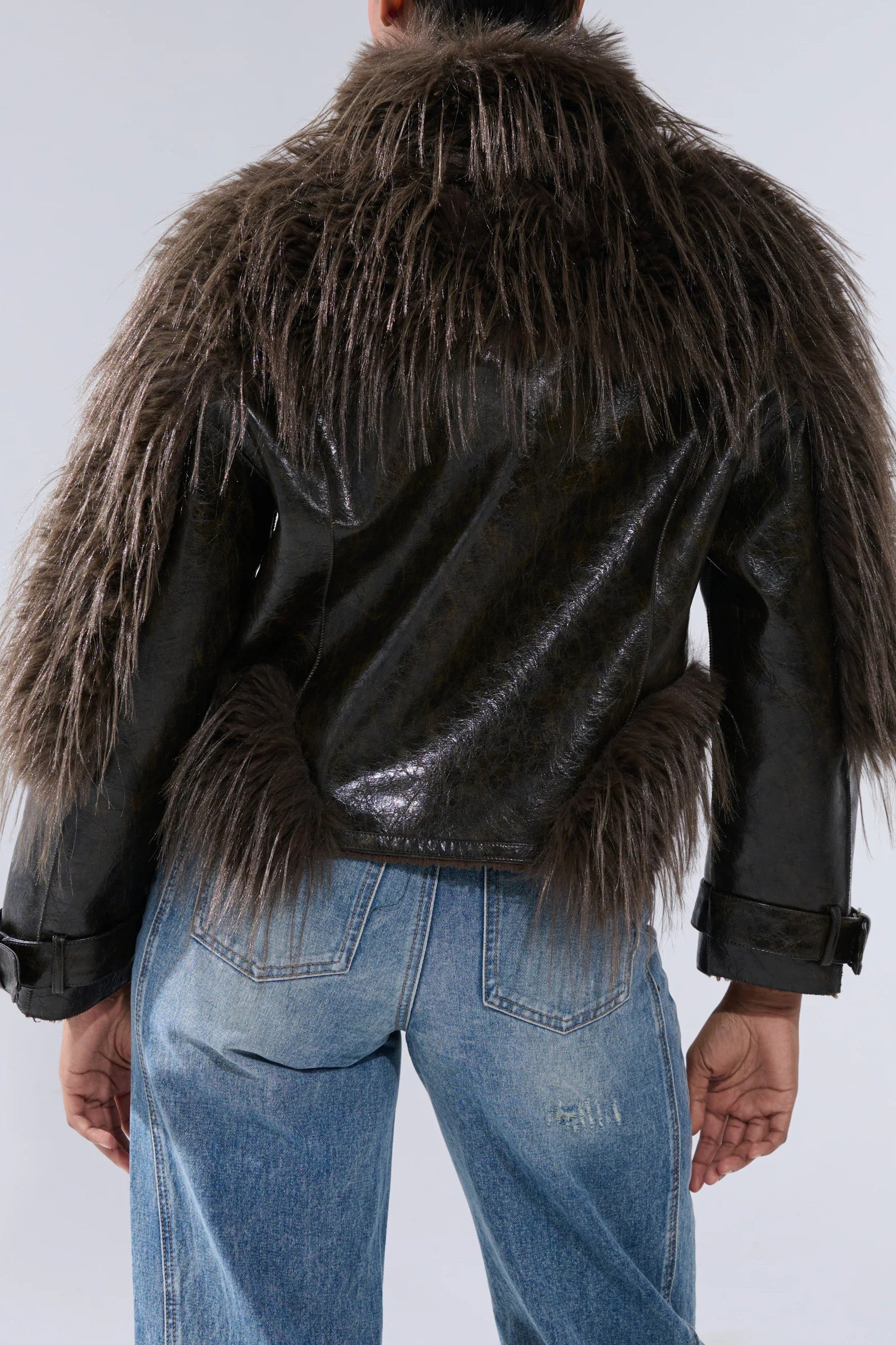 Witch, please. The Leather Jacket With Fur Trim And Tassels is crafted from glossy, worn faux leather and features a standing collar, long-hair faux fur trim running along the collar, shoulders, and side panels, long sleeves with buckle cuffs, a coordinating buckled belt at the hemline, and a front zip closure. Complete with an oversized silhouette. Perfect for layering over fitted dresses, denim, or maxi skirts for the ultimate combination of biker-chic and luxe streetwear style.